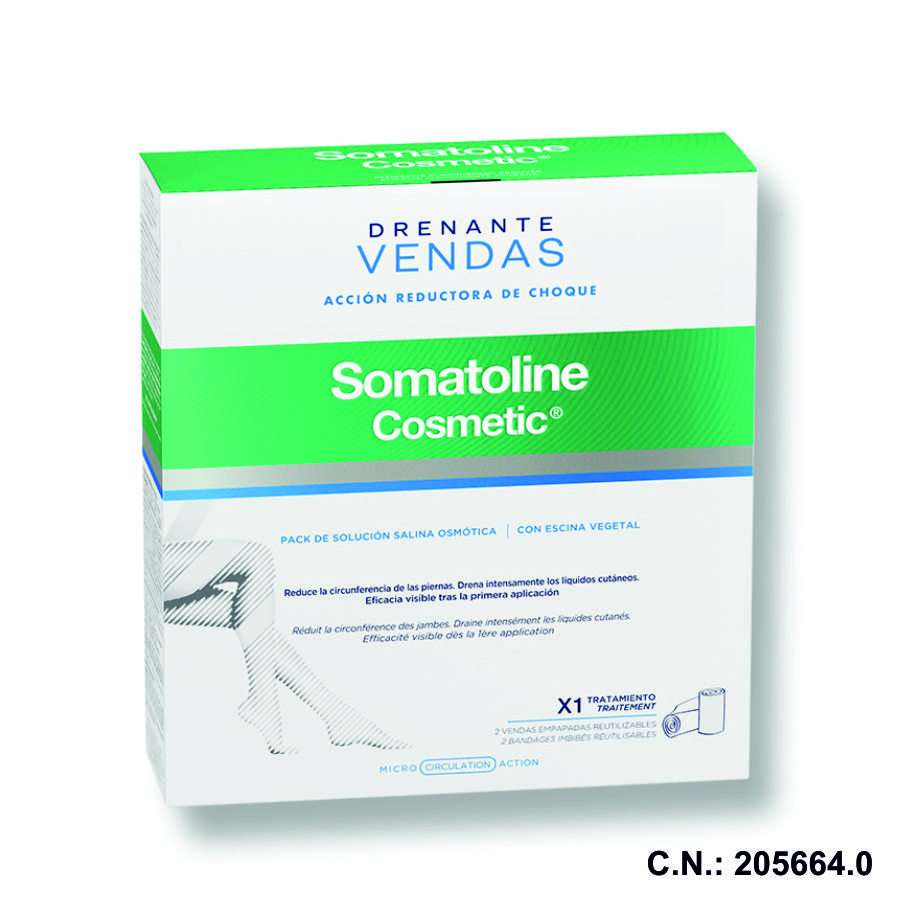 CN: 205664.0 • 1) Coloque las vendas impregnadas alrededor de la pierna empezando por el tobillo y solapando los bordes aproximadamente 1 cm. No las enrolle demasiado apretadas. • 2) Al llegar a la rodilla, estire la pierna y continúe envolviéndola hasta la zona de la ingle. • 3) Asegure el extremo bajo la última vuelta de la venda. Repita en la otra pierna. • 4) Póngase los pantalones y anúdeselos a la cintura. Relájese y deje que actúe durante al menos 50 minutos. • 5) Retire las vendas y limpie los restos que queden en la piel haciendo un masaje con movimientos ascendentes para intensificar los efectos del tratamiento.
